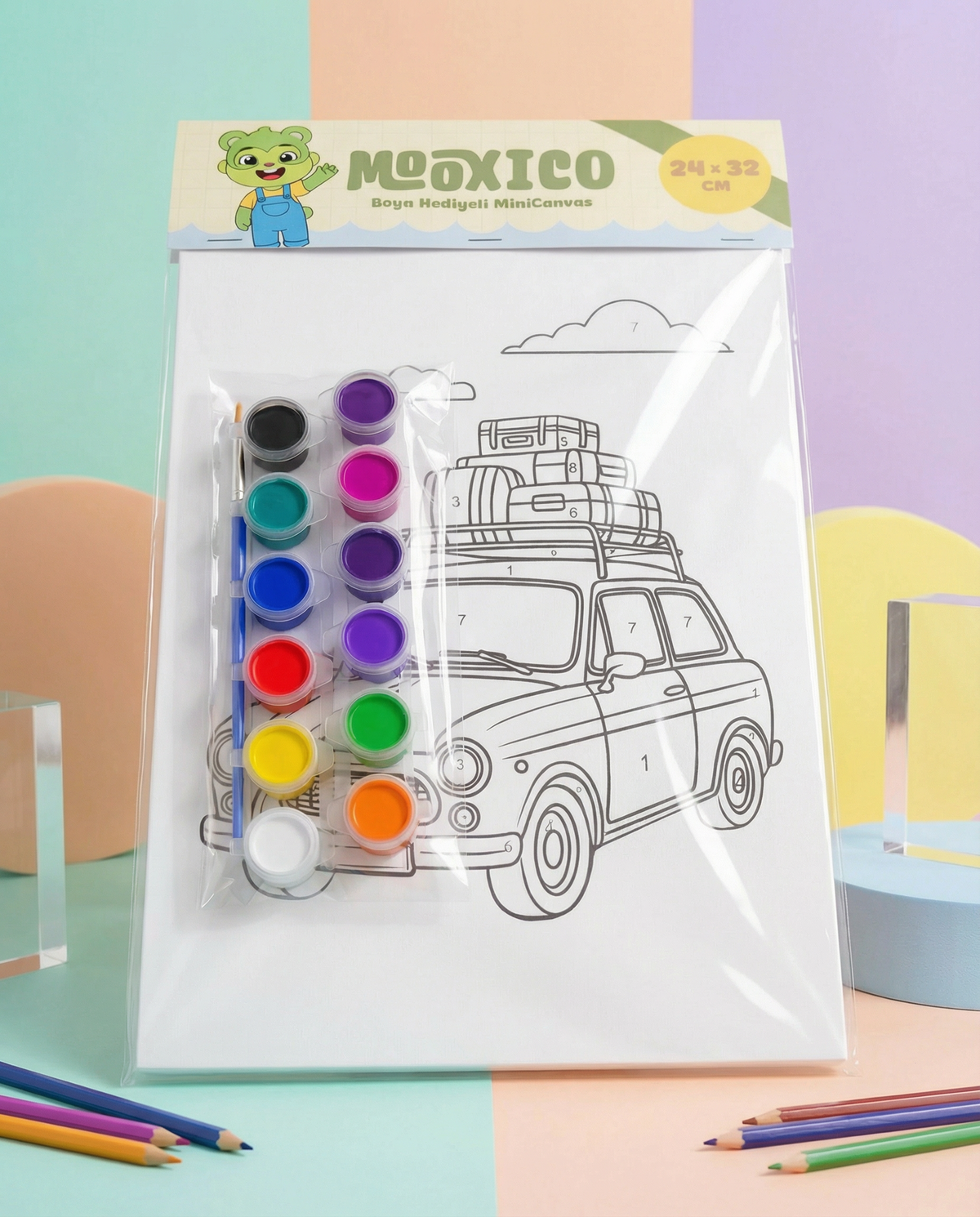 Mooxico MiniCanvas Boyama Seti – Arabalı (24×32 cm, Numaralı Boyama + 12’li Boya)